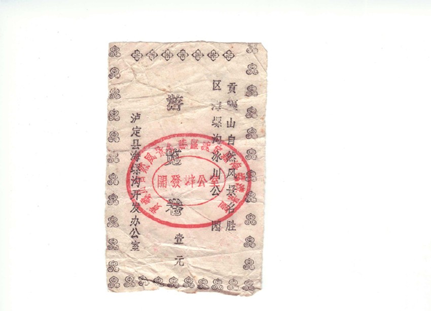 時間一晃到了7月份,海螺溝達到了“有節(jié)制接待”條件。在我向?qū)O前匯報請示,并得到同意后,七月十日將自己構(gòu)思,手工制作的海螺溝“游覽卷”樣卷送孫前過目,并獲通過。于是我買來5色紙,從瀘定縣印刷廠借來“游覽卷”三個中號印刷鉛字釘,指導打字員排版打印在臘紙上。游覽卷分為國內(nèi)和國外游客兩種門卷。用白、蘭、綠三色紙油印壹元面值的國內(nèi)游客門卷;黃、紅二色紙油印貳元面值的海外游客門卷。門卷規(guī)格尺寸為長9.5厘米,寬6厘米,四邊打印花邊圖案,右邊打印豎排兩行“貢嘎山自然風景區(qū)海螺溝冰川公園”;左邊打印豎排“瀘定縣海螺溝開發(fā)辦公室”的落款;門卷正中豎印 “游覽卷”三個字,下方油印面值“壹元”或“貳元”。門卷面值充當起游客進海螺溝的憑證。門卷加蓋一枚雕刻繁體字“貢嘎山自然風景名勝區(qū)瀘定縣海螺溝景區(qū)開發(fā)辦”的紅印章。門卷出售第一天就順風順水。據(jù)1987年8月17日海辦《情況簡報》第二期記載:1987年7月14日海螺溝門票站在磨西中街掛牌成立。當日出售給成都石化廠5名有獎旅游職工壹元國內(nèi)卷5張,15日出售15張國內(nèi)門卷。到7月最后一天,半個月售出國內(nèi)門卷146張。游客來自上海、南京、西安、北京、昆明、廣東、成都、重慶。《海螺溝旅游志》(1984—1995)中記載,海螺溝門卷從1987年7月14日啟用,當年售出門卷1219張,其中國內(nèi)卷1169張,海外卷50張,旅游綜合效益4.87萬元。