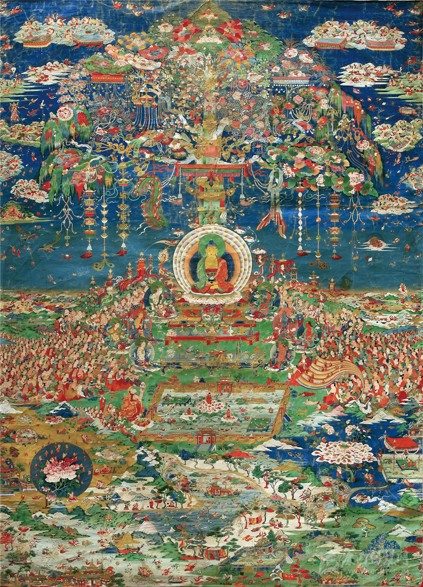 具有超越凡人的精微刻畫能力,也使得郎卡杰在面對(duì)畫布時(shí),有更廣大的空間來展示他的繪畫天賦。從存世的作品《無量光佛凈土》中,看得出郎卡杰喜歡將自己的“毫毛畫師”的能力發(fā)揮到極致。不管是花紋、瓔珞、還是人物,但凡是畫面上出現(xiàn)的物象,他都會(huì)以精致、繁密的形式出現(xiàn)。所以他的畫面世界里往往都是人山人海、琳瑯滿目;盈寸之間,容納萬千;場(chǎng)面浩瀚、氣勢(shì)恢宏、不可思議!