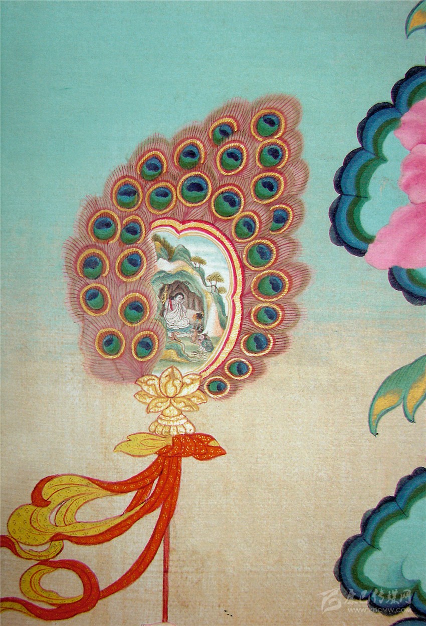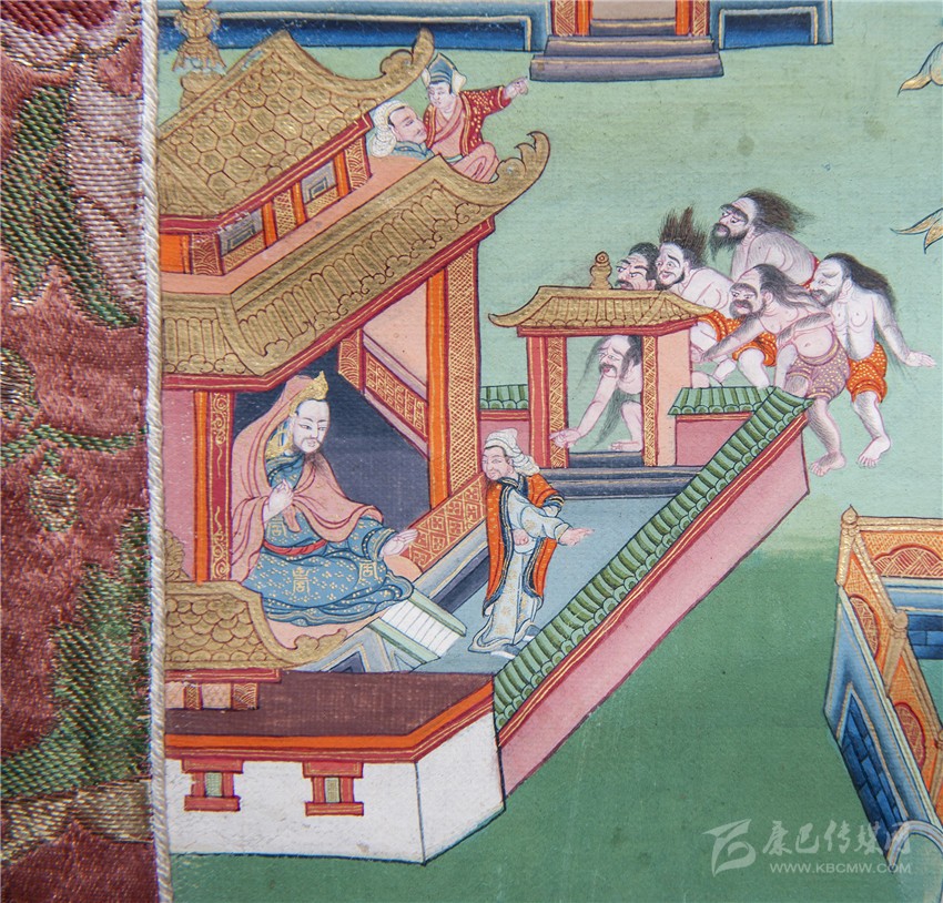 再看《如意寶藤》的另一個(gè)局部,對(duì)比唐卡裱邊,我們可以看出大約十公分見方的畫面里,郎卡杰描繪了十個(gè)人物和一棟宮殿,畫面還顯得很疏朗;圍墻外的“邪魔外道”身上不僅分染了體積,還描繪了五官須眉和汗毛。漢式宮殿內(nèi)外墻磚上,還刻畫了精微的花紋和裝飾,郎卡杰的“神變”畫技由此可見。而這樣的微型畫中畫,在郎卡杰作品中大量存在,精彩絕倫。圖二《如意寶藤》局部