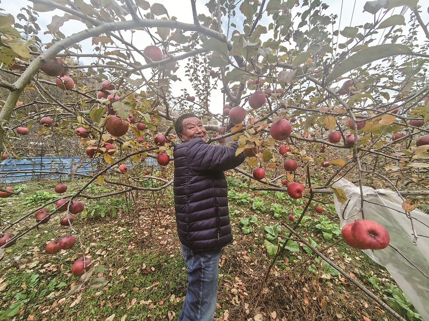 村民賀先云正在采摘蘋果。
