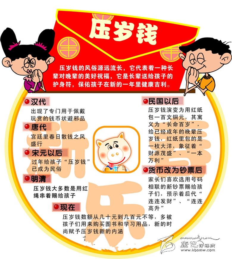 民間的習慣都是守歲守到半夜,即從除夕那天的亥時至元旦那天的子時之間開始入席,稱之為“分歲酒”。一家人歡歡喜喜地喝完分歲酒之后,長輩還要給小孩子們分“壓歲錢”。舊時的風俗,壓歲錢規(guī)定一百枚,用紅繩串好,取百年長壽的意思。當然,目前改為給給鈔票,數