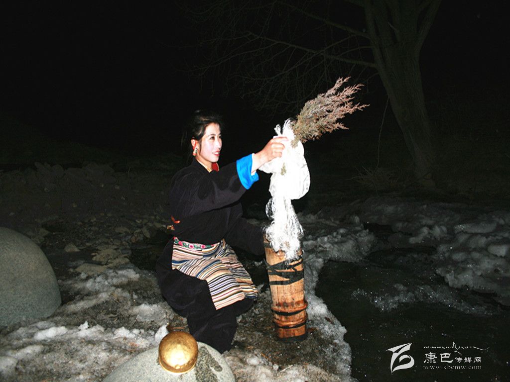 在除夕這天,家里的婦女會把庭院,房屋重新打掃一遍。把垃圾再清理一次。因為習俗認為,初一掃地和除垃圾會把一年的財運和好運都掃走。這天,大人小孩還要忙著洗頭、洗澡,搞好個人清潔衛(wèi)生。而除夕之夜最重要的一個儀式是“搶頭水”。(新年的第一桶水—晨星水)。傳說,晨星水是人間最吉祥的水。它可以獻神,可以潔身,可以祛病,洗滌一切污垢和不祥,帶來平安和幸福。從除夕夜十二時開始,一個個懷抱柏樹枝和哈達的姑娘或小伙子們披著繁星,爭先恐后地去背晨星水。第一個先到河邊的要熏燃桑煙,并用哈達繞上柏樹枝蘸水向空中拋灑三次,并把柏樹枝放在河邊。背回的晨星水首先要供奉佛祖。然后才可以用來燒茶、洗漱。而家里的五谷斗上則盛滿了糌粑、炒青稞粒、人參果等食品,上插青稞穗,也有在八寶碗里用糌粑和五彩酥油做成“切巴”,供奉在佛堂里。這一切都是為了祈禱來年風調雨順、人畜兩旺、喜獲豐收。除夕夜,在正房桌子上還要擺上各式油炸果子、牛肉坨坨、糖果以及青稞美酒、飲料等等美味佳肴,開始迎接新年的到來。