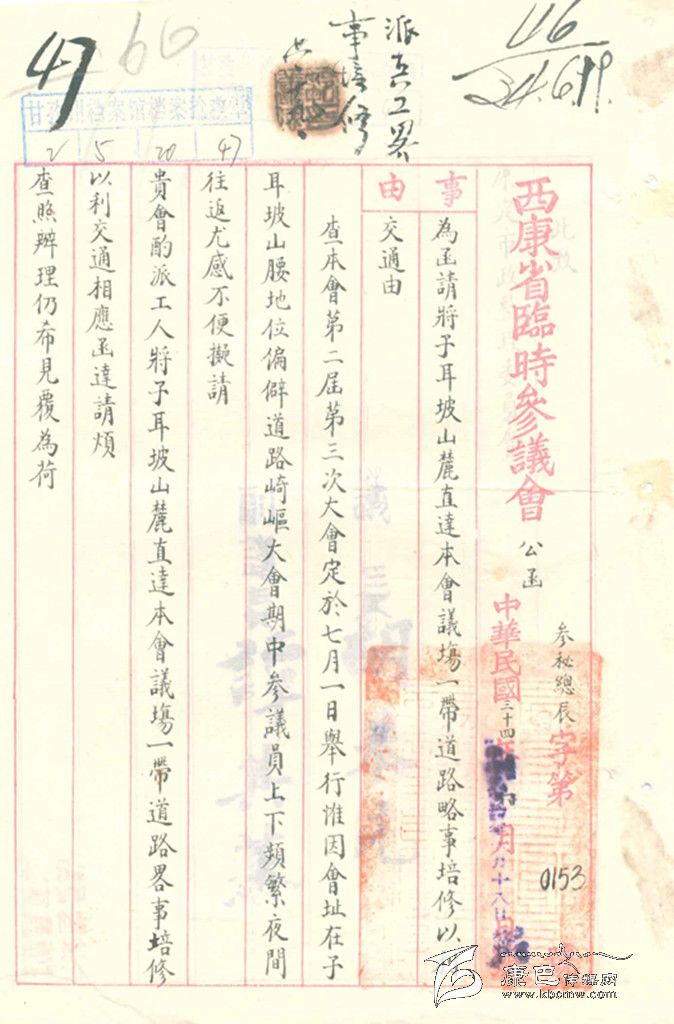1938年,在子耳坡山腳、如今的州委黨校的地址上,“西康省建省委員會(huì)”修建了一幢本意是用來作為接待過往達(dá)官貴人的“籌邊別墅”。這是幢一樓一底的木石結(jié)構(gòu)建筑,當(dāng)年是康定城最氣派的建筑。1939年,西康省臨時(shí)參議會(huì)成立,沒有會(huì)址,沒有辦公地點(diǎn),新成立的西康省政府便把“籌邊別墅”撥給西康省臨時(shí)參議會(huì)作為會(huì)址。但是要從城里走到子耳坡山腳,最近便的道路是從中橋附近轉(zhuǎn)到當(dāng)時(shí)的茶店街(現(xiàn)在的建設(shè)路靠東的一段),再沿山往上行。由于是土路,亂石遍地,不好走。于是,當(dāng)時(shí)的參議長(zhǎng)胡恭先親自動(dòng)筆,至函“西康省會(huì)市政建設(shè)整理委員會(huì)”要求整修這條小道。這里的文字檔案記載的就是這件事。