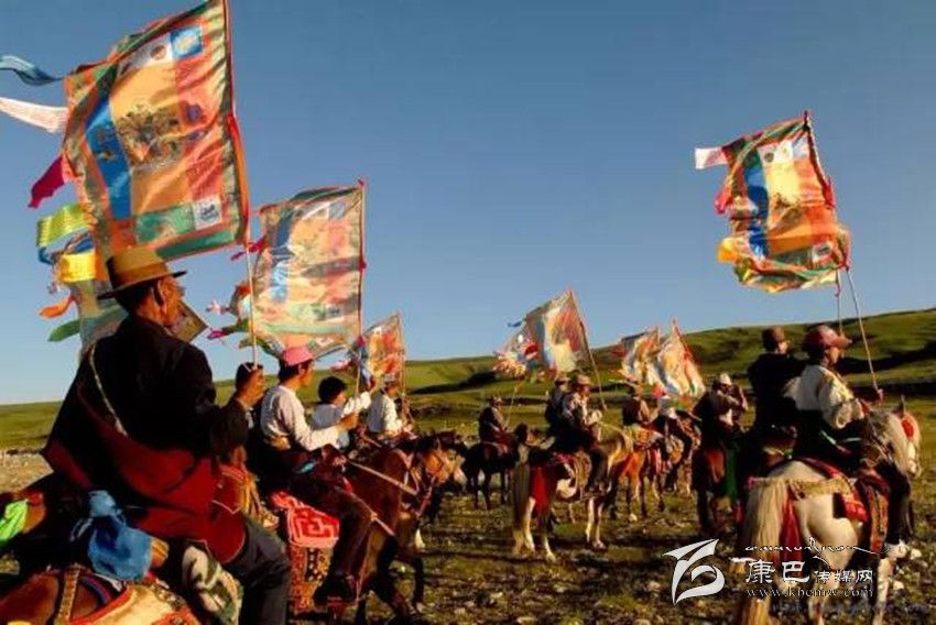 藏歷五月初四,就是色達(dá)牧民的祭神節(jié)。這天,牧民們在各色布上印上象征福氣的經(jīng)文,在經(jīng)旗周邊裝飾上白、紅、黃、綠、蘭布條。男子在自己的火槍槍架上,飾以經(jīng)幡,上邊掛一緞制煙祭用的小袋騎馬趕赴節(jié)日集會(huì)地點(diǎn)。