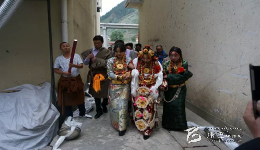 接親。除表現(xiàn)主人的熱情、好客、大方外,還要講究氣派,顯富有、高檔次、高規(guī)格。以娶親為例,舉行婚禮的當(dāng)天,男方要組織數(shù)十匹馬隊或高檔汽車接親,披金掛銀,蔟新華麗。接親的馬隊從新娘家出發(fā)后,男方要在家或路過人家必經(jīng)之地設(shè)置吉祥物,如盛滿一桶水或鋪一床藏毯、或隨身衣物鋪在地上,當(dāng)接送新娘的馬隊路過時,接親的人要給吉祥物獻哈達和拋撒銀錢、紙錢和糖果等以示新娘路遇彩頭、沖喜,表示吉祥如意。到男方家后新娘被扶下馬或扶下車,高僧大德頌吉祥詞后,圍繞所放佛像或吉祥八寶圖及裝滿水或牛奶的銅鍋順轉(zhuǎn)三圈后,踩著從大門口鋪至經(jīng)堂的藏毯進屋,進入客廳之前新娘只身先進廚房,點燃灶里準(zhǔn)備好的柏香紅木或枝葉進行熏煙,據(jù)藏醫(yī)考證熏香煙對身心健康有益,也可表示從即日起新娘便是男家的主婦了。