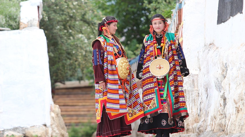在鄉(xiāng)城可見到盛唐年間遺落的痕跡。至今,這里的藏族姑娘、婦女還穿著文成公主進(jìn)藏時(shí)的“瘋裝”,整個(gè)服飾五顏六色,絢麗至極。裙子上有108個(gè)褶。這種服飾在今天的阿里地區(qū)仍有,但其他藏區(qū)就極為罕見了。