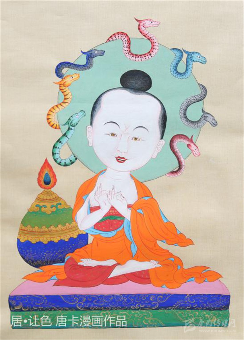 唐卡是藏族最具代表性的藝術(shù)門(mén)類(lèi)之一,在其千年的傳承歷史中吸收融合了印度、尼泊爾等多地的藝術(shù)元素,發(fā)展成為極具雪域特色和審美價(jià)值的藝術(shù)形式。傳統(tǒng)唐卡缺乏立體感和形象感,畫(huà)面層次模糊,人物形象單薄,不利于民族文化傳承,“對(duì)于不懂畫(huà)的人來(lái)說(shuō),這種畫(huà)法他們看不懂?!被诖?,居·讓色對(duì)唐卡繪畫(huà)技法作了改良,結(jié)合現(xiàn)代漫畫(huà),以寫(xiě)實(shí)的手法,實(shí)現(xiàn)活態(tài)傳承、永續(xù)流傳目的。