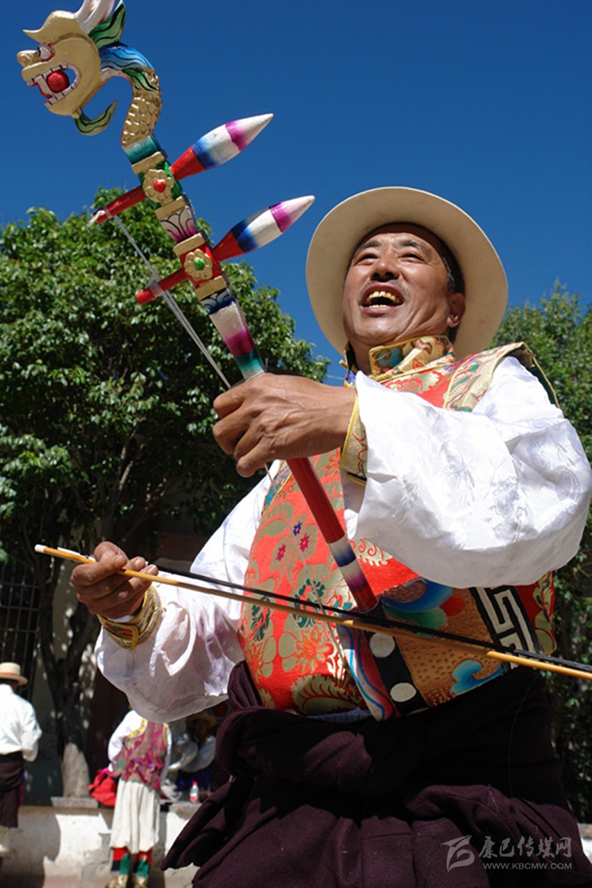 八歲時(shí),就從外婆那里學(xué)會(huì)了拉“胡幾”,拉得不好,鄰居們笑:“咿咿呀呀的,像驢子在叫”。人們?cè)谔镩g地角跳弦子時(shí),他夾在圈子里“臊堂子”調(diào)皮,后來(lái)便跟著大人跳,跳著跳著就學(xué)會(huì)了。有些動(dòng)作不標(biāo)準(zhǔn),外婆和母親就會(huì)笑著糾正。1972年,縣上的“毛澤東思想文藝宣傳隊(duì)”選中了剛滿十四歲的他,在“文革”中后期鋪天蓋地的運(yùn)動(dòng)中,他們上山下鄉(xiāng)進(jìn)軍營(yíng)送文化,弦子舞技得到強(qiáng)化,藏二胡就是在這期間越拉越好的。那時(shí)候糧食還沒(méi)有過(guò)關(guān),公社分配的工分又重,家里的日子過(guò)得很艱難。經(jīng)常跟宣傳隊(duì)唱唱跳跳,可以不做那些繁重的農(nóng)活了,他還暗地里偷偷慶幸過(guò)?!拔母铩苯Y(jié)束后,縣上成立了業(yè)余弦子隊(duì),他自然也在其中,這時(shí),他已經(jīng)能記住二百多首弦子詞曲了。西藏恢復(fù)雪頓節(jié)那年,應(yīng)該是1986年吧,他們又跳到了圣地拉薩,受到了西藏各地官員和群眾的歡迎??途永_的巴塘人在雪頓節(jié)盛典上看到巴塘弦子,流下了激動(dòng)的淚水,很多人過(guò)來(lái)跟他們“打招呼”,問(wèn)候家鄉(xiāng)人。跳弦子五十多年,去拉薩應(yīng)該是最難忘的事情了?!鞍桌瓫_!說(shuō)拉薩道拉薩,拉薩建在海面上?!边@是小時(shí)候外婆教他唱的。和所有的藏族一樣,他從小就向往那塊圣地。八十年代交通極其不方便,去成都都要走整整四天,去拉薩多難啊,所以村里人都很羨慕他們弦子隊(duì)。他還記得,在向布達(dá)拉宮虔身朝拜的那一刻,他流下了感動(dòng)和幸福的淚水。
